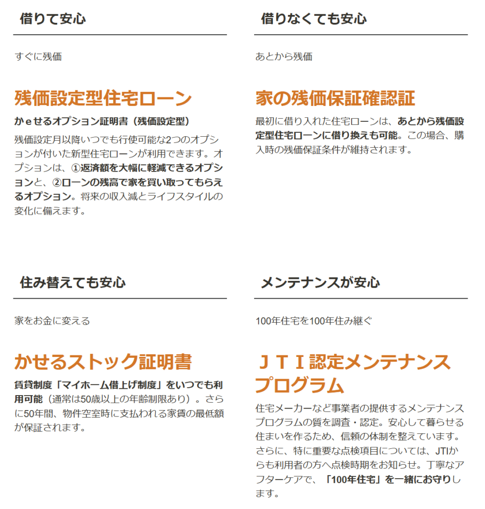 JTIが指定するハウスメーカーで建築された建物を購入する際に利用する住宅ローンを、JTIが指定する金融機関を通し利用する事で、残価設定型住宅ローンでの残価等をJTIが保証する仕組みです。